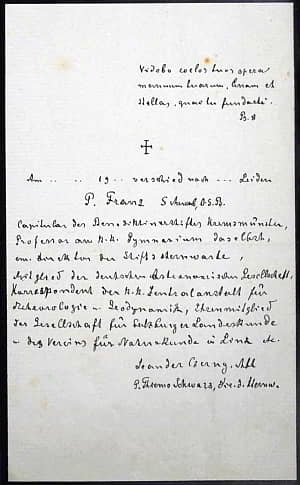 Euer Hochwürden! Der mir von Ihnen vorgelegte Plan hat mich außerordentlich erfreut. Ich hielte es für sehr wertvoll, wenn die Erfahrungen von Ihnen in Kremsmünster in Bezug auf die Flora des Gebietes gesammelt und kartografisch dargestellt würden. Gerade dadurch, daß in Kremsmünster klimatologische und phänologische Daten, die sich direkt auf das pflanzengeographisch bearbeitete Gebiet beziehen, vorliegen, würde diese Bearbeitung zu einer sehr wertvollen machen. Sie wäre viel mehr ... als die meisten anderen mit der Kartographie verbundenen Arbeiten, die meistens nur auf vorübergehenden Aufenthalten im Gebiet basieren. Seien Sie überzeugt, daß es mir eine Freude wäre, wenn ich Ihnen bei der Durchführung der Arbeit behilflich sein könnte. Den vorgelegten Entwurf halte ich für sehr gut. Nur bezüglich Absatz VI habe ich das Bedenken, daß er vielleicht zu umfangreich werden könnte, ohne verhältnismäßig viel Neues zu bringen. Er könnte vielleicht ersetzt werden durch einen Abschnitt, der die floristisch bemerkenswerten Vorkommnisse aufführt. Dies ist allerdings nur eine subjektive Meinung, die durchaus nicht maßgebend sein soll. Ich bemerke schon jetzt, daß es der zool. bot. Gesellschaft eine Freude wäre, diese Karte mit dem Texte in die Folge der von ihr publizierten Vorarbeiten zu einer pflanzengeographischen Karte Österreichs herauszugeben, wenn es Ihnen paßt. Nur würden wir dann bitten, daß der Maßstab der Karte (1:75.000) und die Farbengebung für die Formationen sich tunlichst an die bisher ausgegebenen Karten anschließen. Was Literatur anbelangt, so sende ich Ihnen heute die beiden kleinen Abhandlungen von Kerner und Wettstein (bitte beide in Ihre Bibliothek einzureihen). Kerner, Pflanzenleben der Donauländer könnten Sie an der Zool. bot. Gesellschaft entlehnen. Die beiden Bücher von Drude (Pflanzengeographie und Pflanzengeographie von Deutschland) könnten Sie an der Bibliothek unseres Institutes - wenn auch nicht für allzulange - erhalten; bitte nur darum zu schreiben, woher sie die Bücher wollen. Mit besten Grüßen und hochachtungsvoll ... Ihr Wettstein.